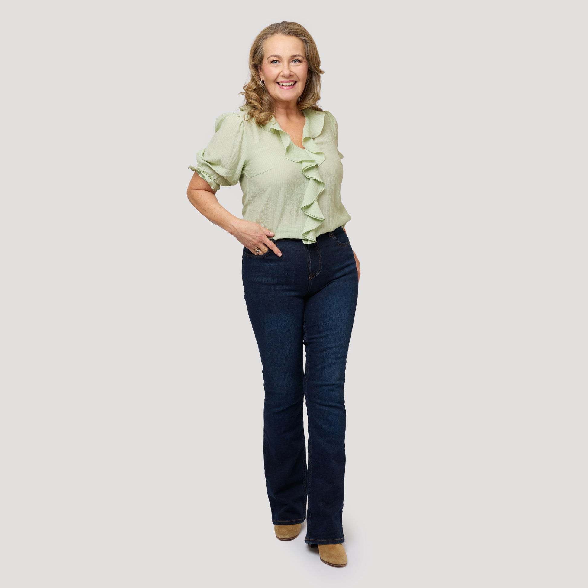 Vaaleanvihreä röyhelöpusero tummansinisille farkuille