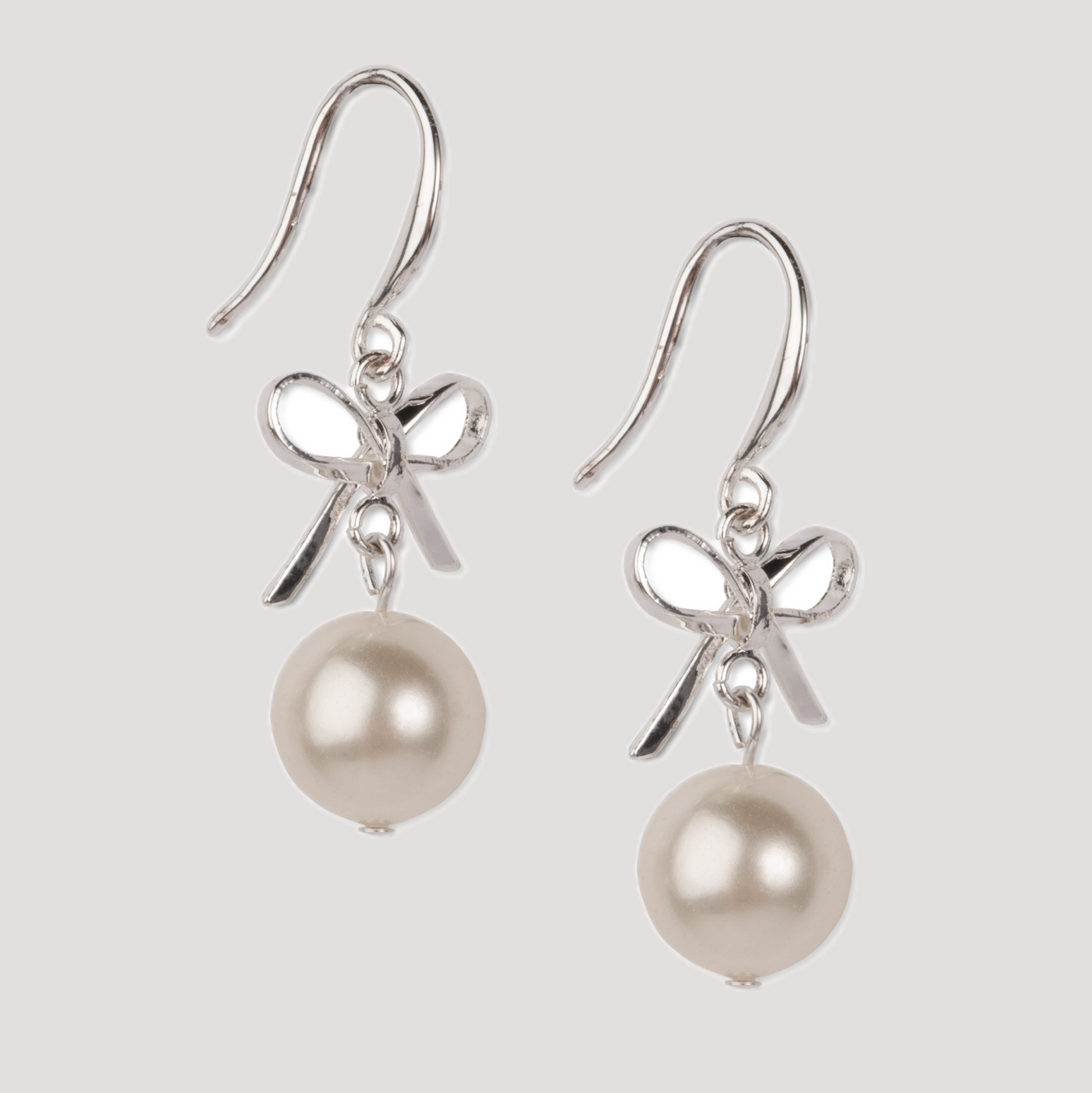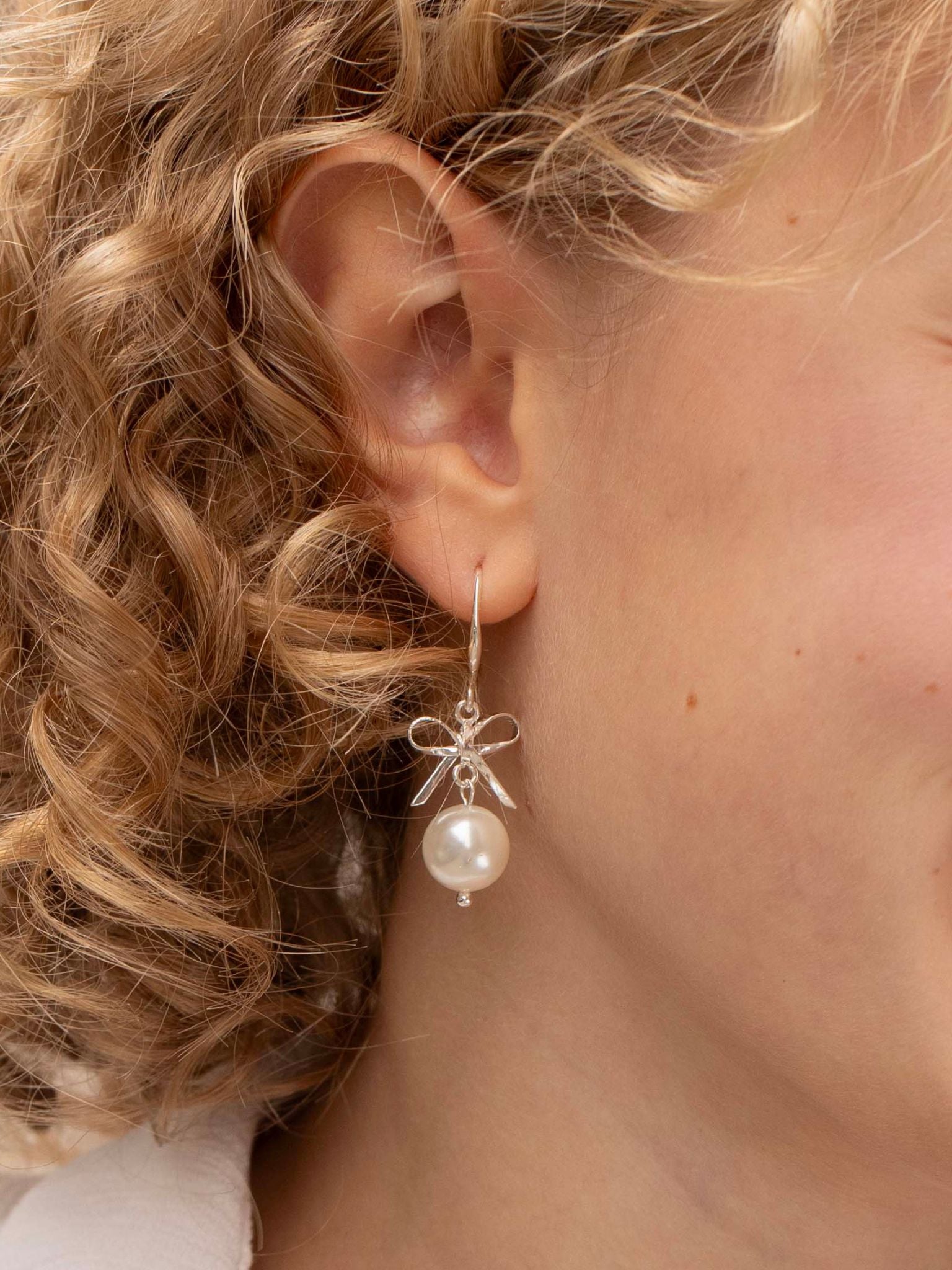 Fina örhängen med en metallrosetter och vita pärlor som dinglar under rosetten. Örhänget är silverpläterat och pärlorna är Mother of pearls och 1 cm i diameter. Hela örhänget är 3,6 cm högt inklusive kroken. Nickelsäkert.