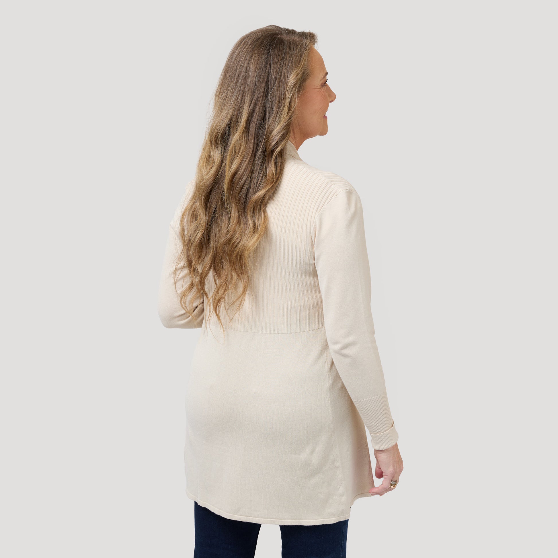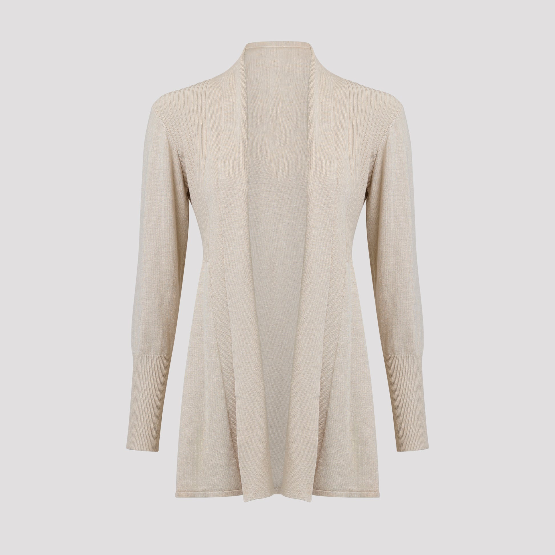 Ljusbeige finstickad öppen kofta med sjalkrage. Koftan har en ribb till midja som ger en smickrande form. Denna tunna cardigan har en lång ribbad mudd vid ärmslutet som med fördel kan vikas upp. Vår modell Yvonne är 170 cm och har storlek M på sig.