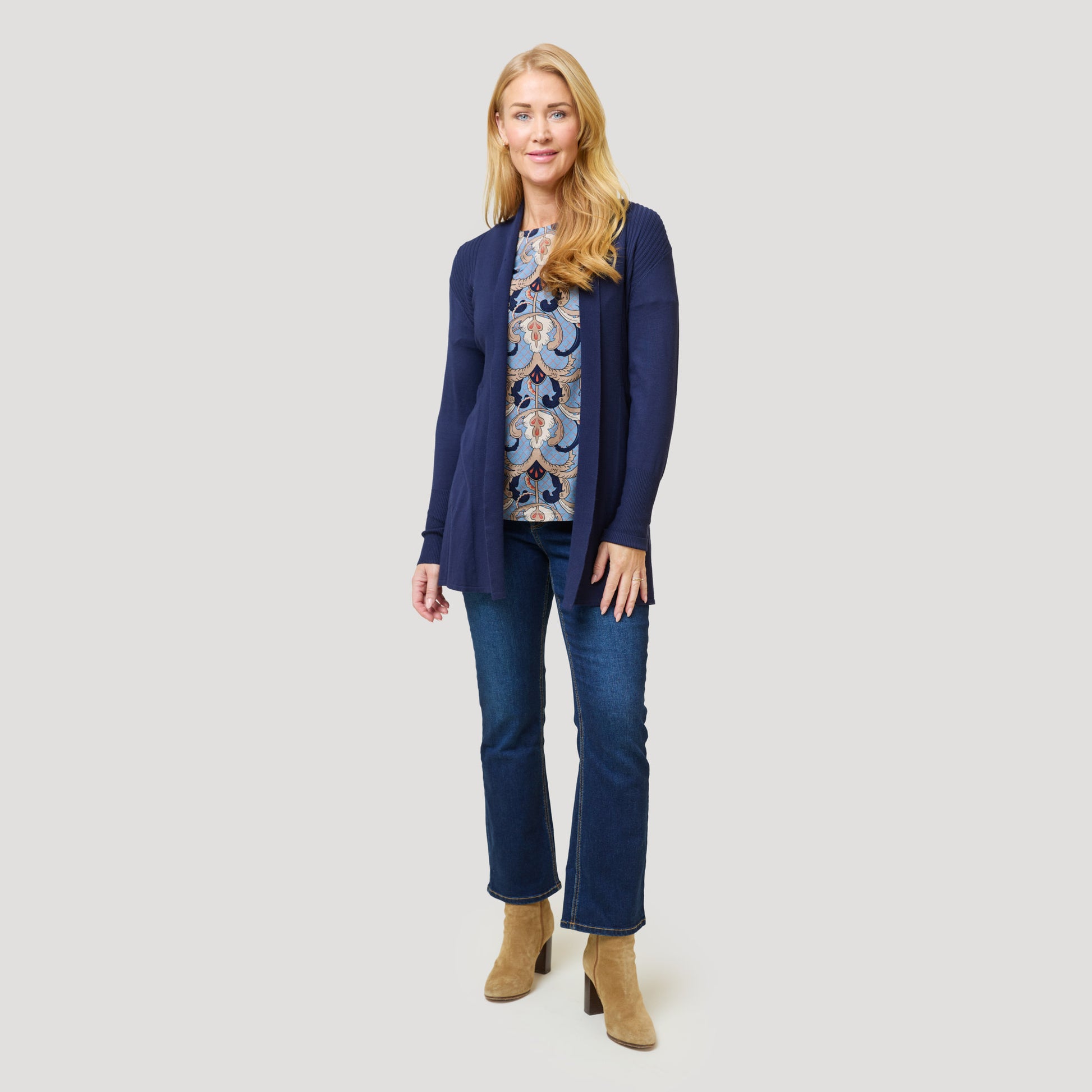 Monivärinen toppi tummansiniseen