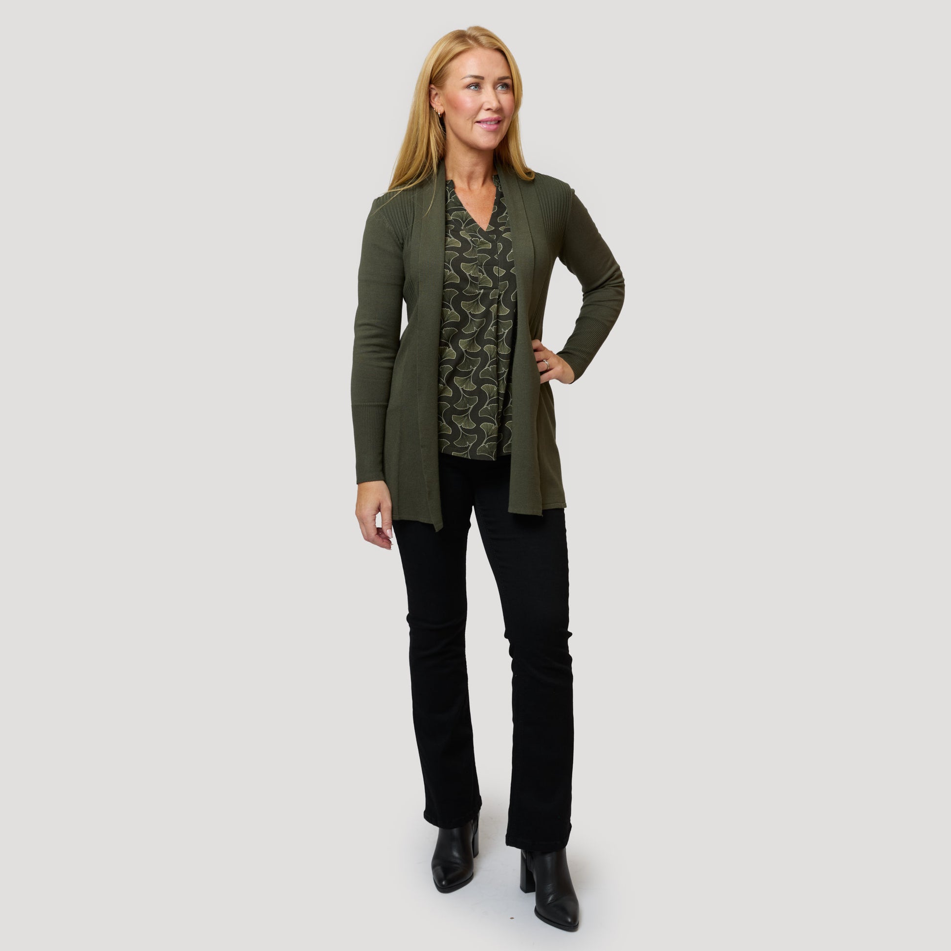 Grönmönstrad trikåtopp till svarta jeans