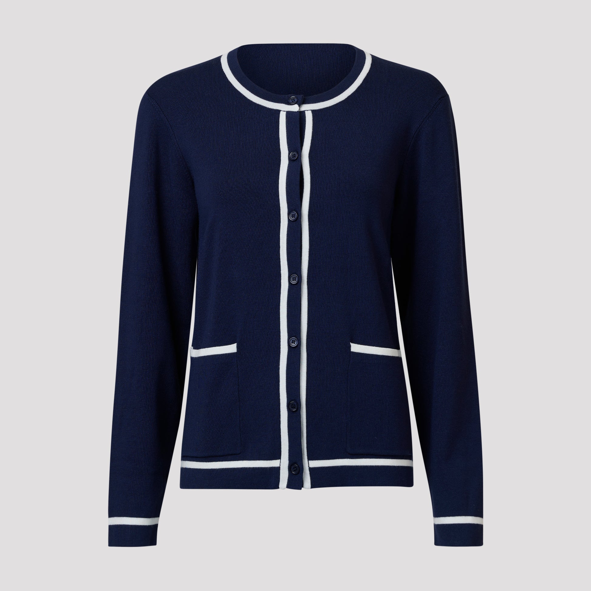Tummansininen klassinen neuletakki, jossa taskut ja tyylikkäät valkoiset kontrastivärit pääntiessä, nappilistassa, taskuissa ja hihansuissa. Pehmeä neuletakki kauniilla tummansinisillä napeilla. Mallimme Yvonne on 170 cm pitkä ja käyttää kokoa S.
