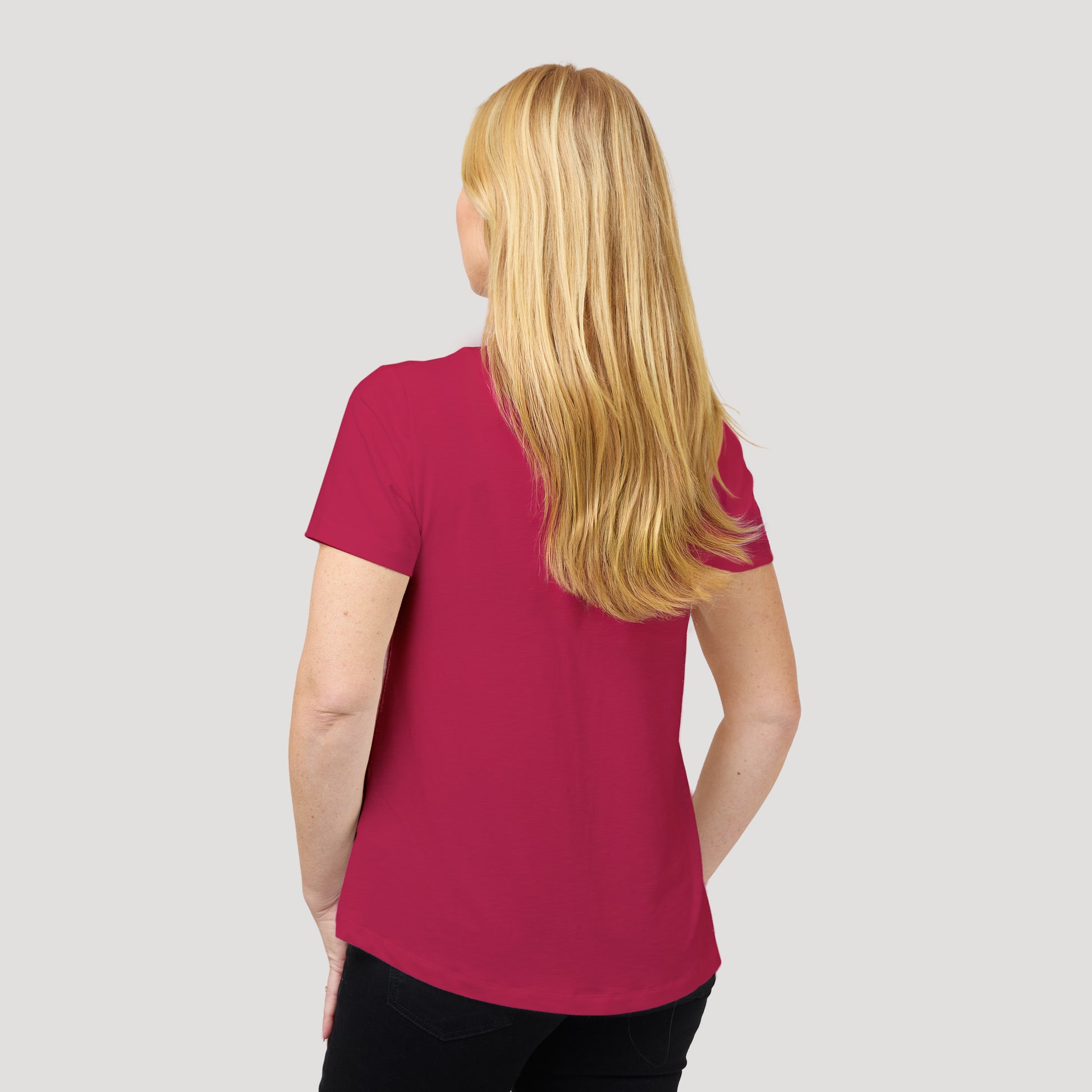 V-aukkoinen paita lyhyillä hihoilla. Vadelmanpunainen viskoosipusero, jossa pyöristetty helma. Nämä topit ovat uskomattoman suosittuja perusvaatteita! Malli on samanlainen kuin edellinen tuote Karlie, mutta hieman paksummasta materiaalista. Mallimme Marianne on 170 cm pitkä ja käyttää kokoa S.