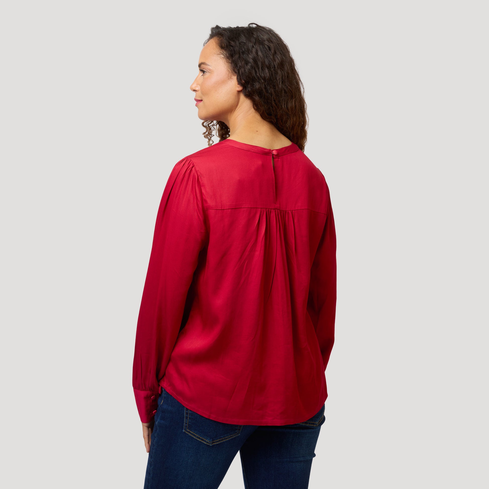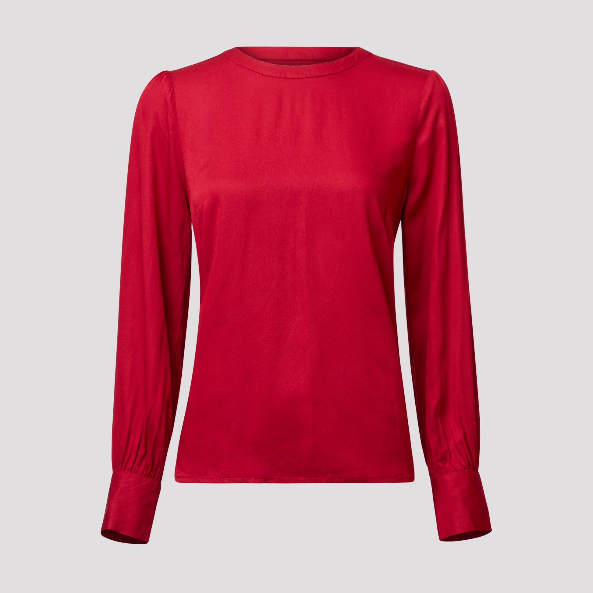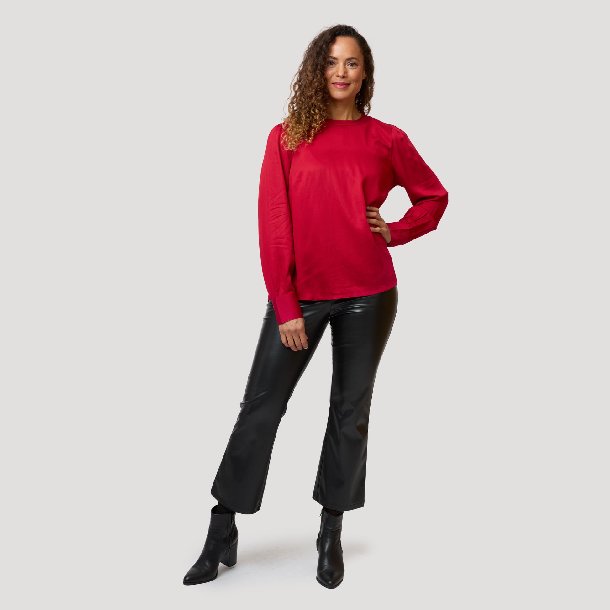 Punainen pyöreäkauluksinen pusero mukavaa viskoosia, jossa pitkät hihat. Tummanpunaisessa puserossa on kaarroke, jossa on rypytys takana halkion alla ja nappikiinnitys pääntiessä. Hihassa on myös pieni rypytys olkapäällä ja korkea hihansuu, jossa on päällystetyt napit. Mallimme Charlene on 170 cm pitkä ja käyttää kokoa S.