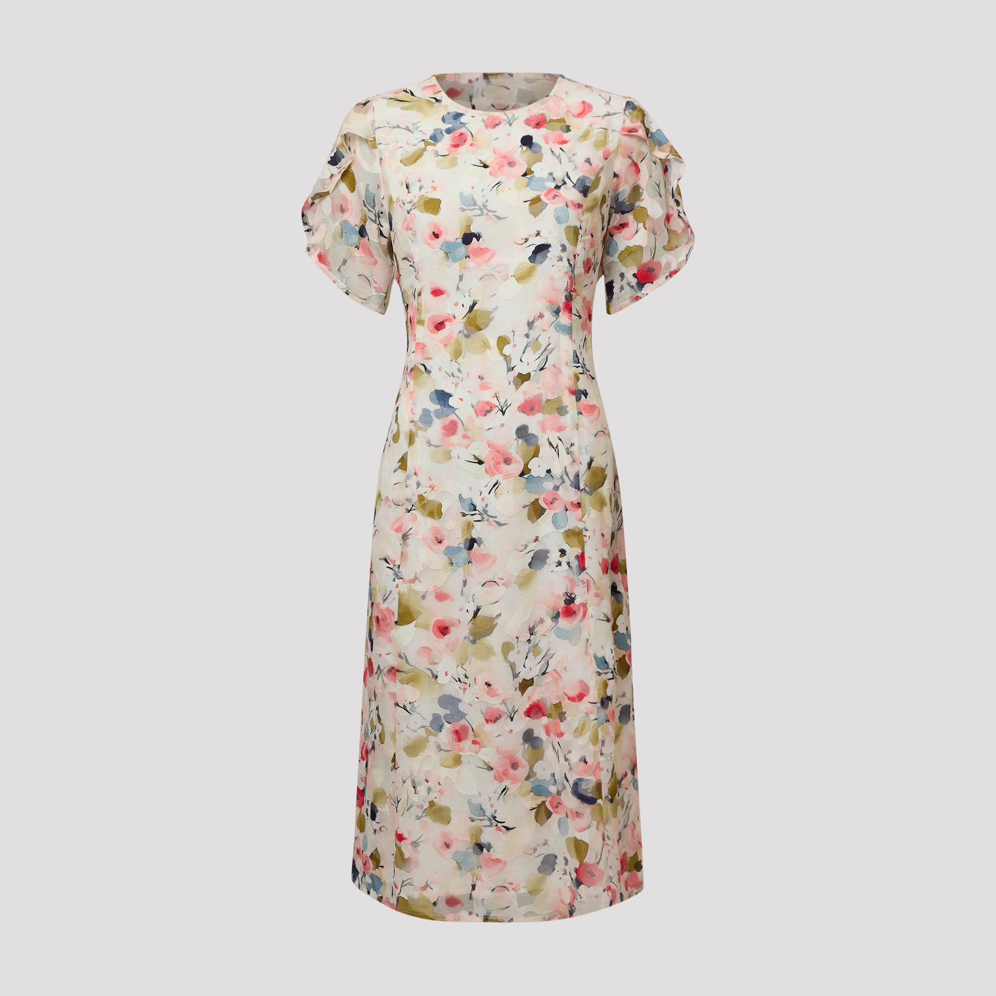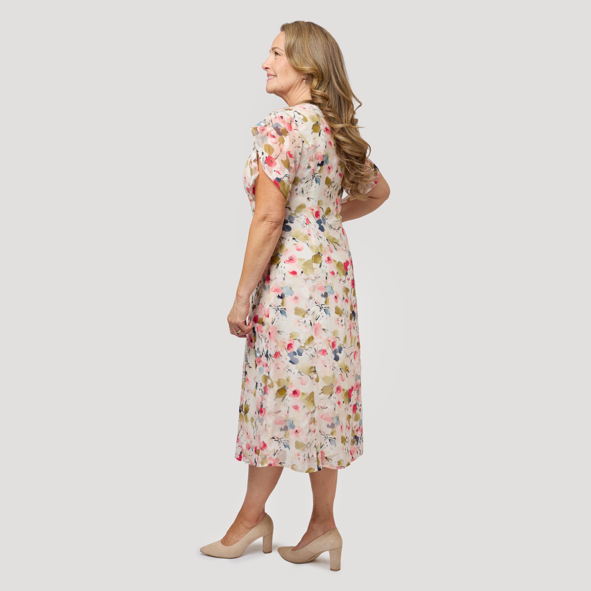 Kaunis pyöreäkauluksinen mekko perhoshihoilla. Juhlava kukkakuvioinen kesämekko, jossa on pitkittäissaumat imartelevaa istuvuutta varten. Juhlamekossa on vetoketju sivussa ja halkio pääntiessä, jossa on nappikiinnitys. Vuori on mukavalla viskoosivuorilla, joka antaa viileän olon. Mallimme Yvonne on 170 cm pitkä ja käyttää kokoa S.