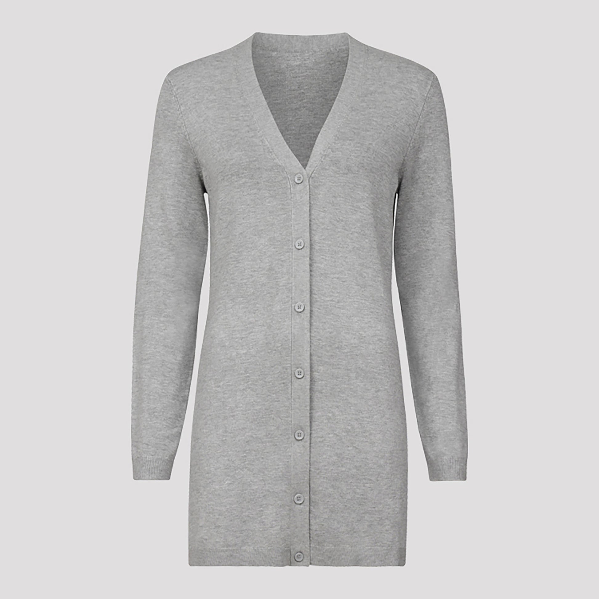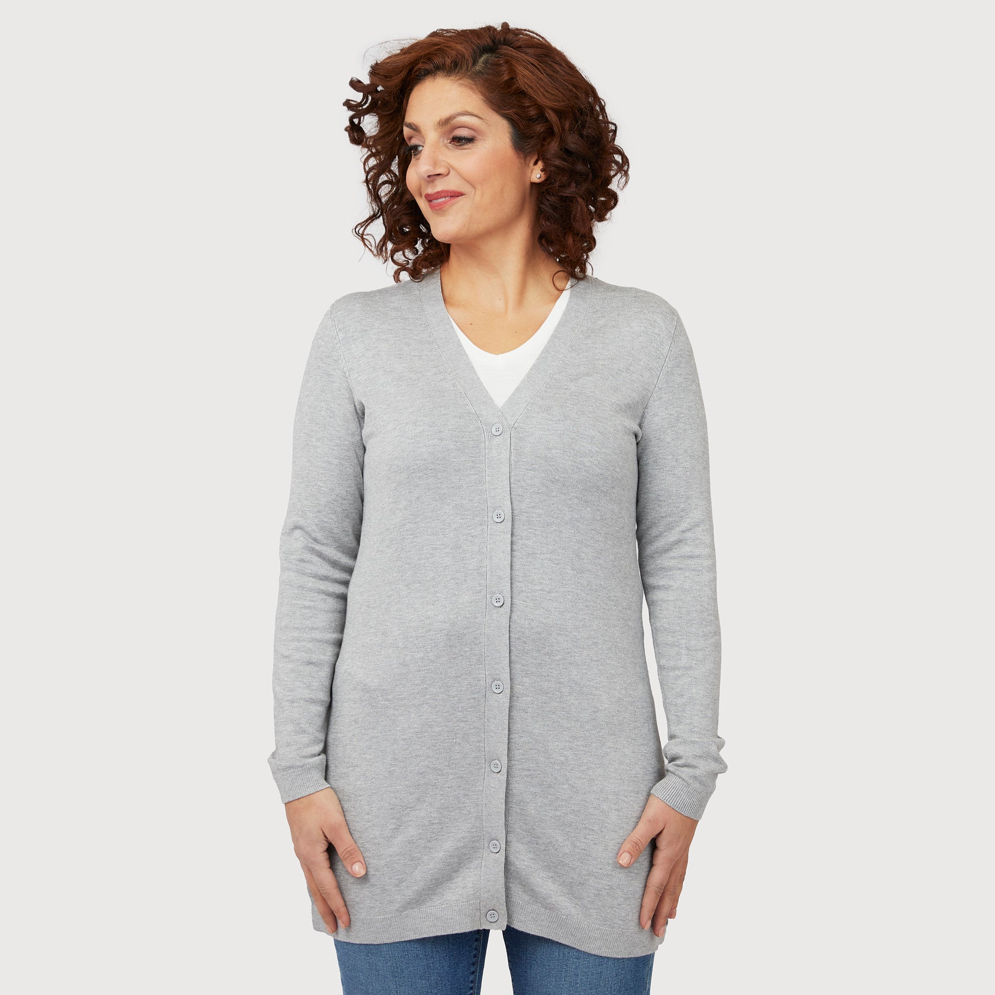 Pehmeä ja mukava, pitkähihainen, harmaa neuletakki. Neuletakissa on v-pääntie, napitus edessä ja pieni halkio sivulla. JOY Essential Item -neuletakki. Mallimme Yasmine on 163 cm pitkä ja käyttää kokoa M.