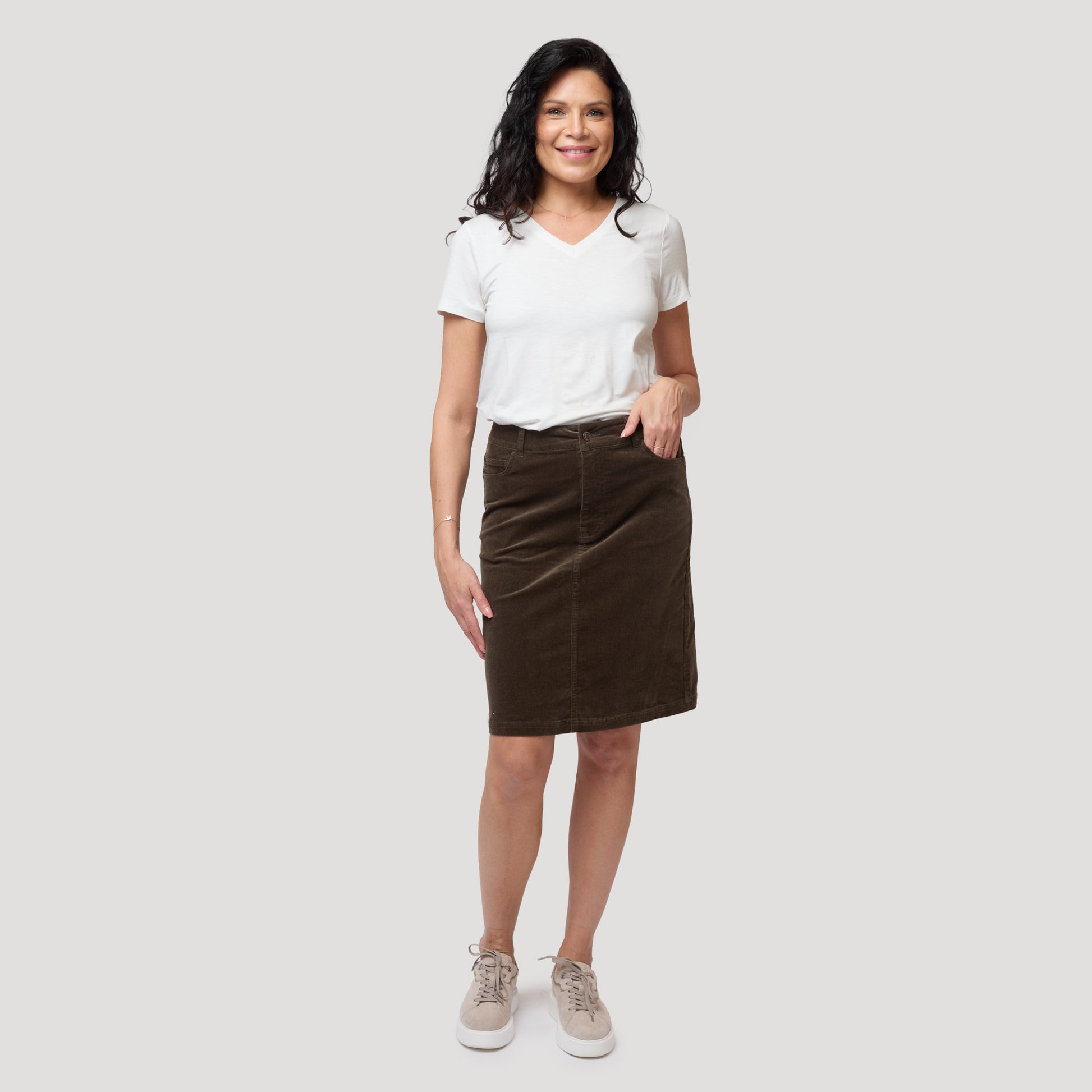 Vihreä vakosamettihame vaalean yläosan kanssa