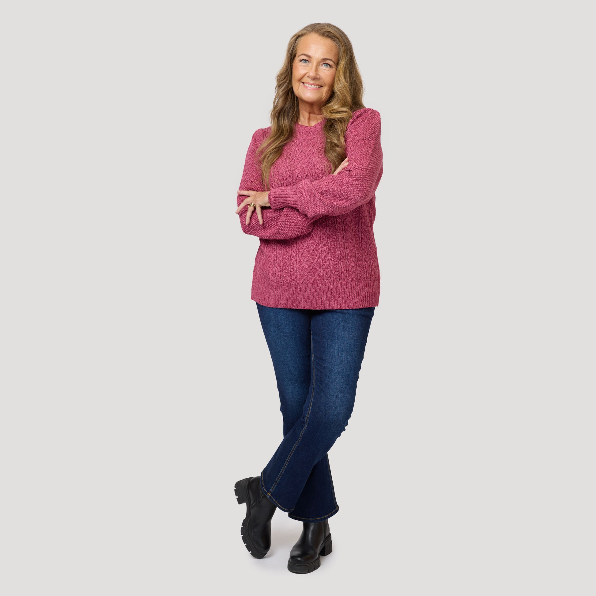 Mörkblå jeans till tröja i hallonrött