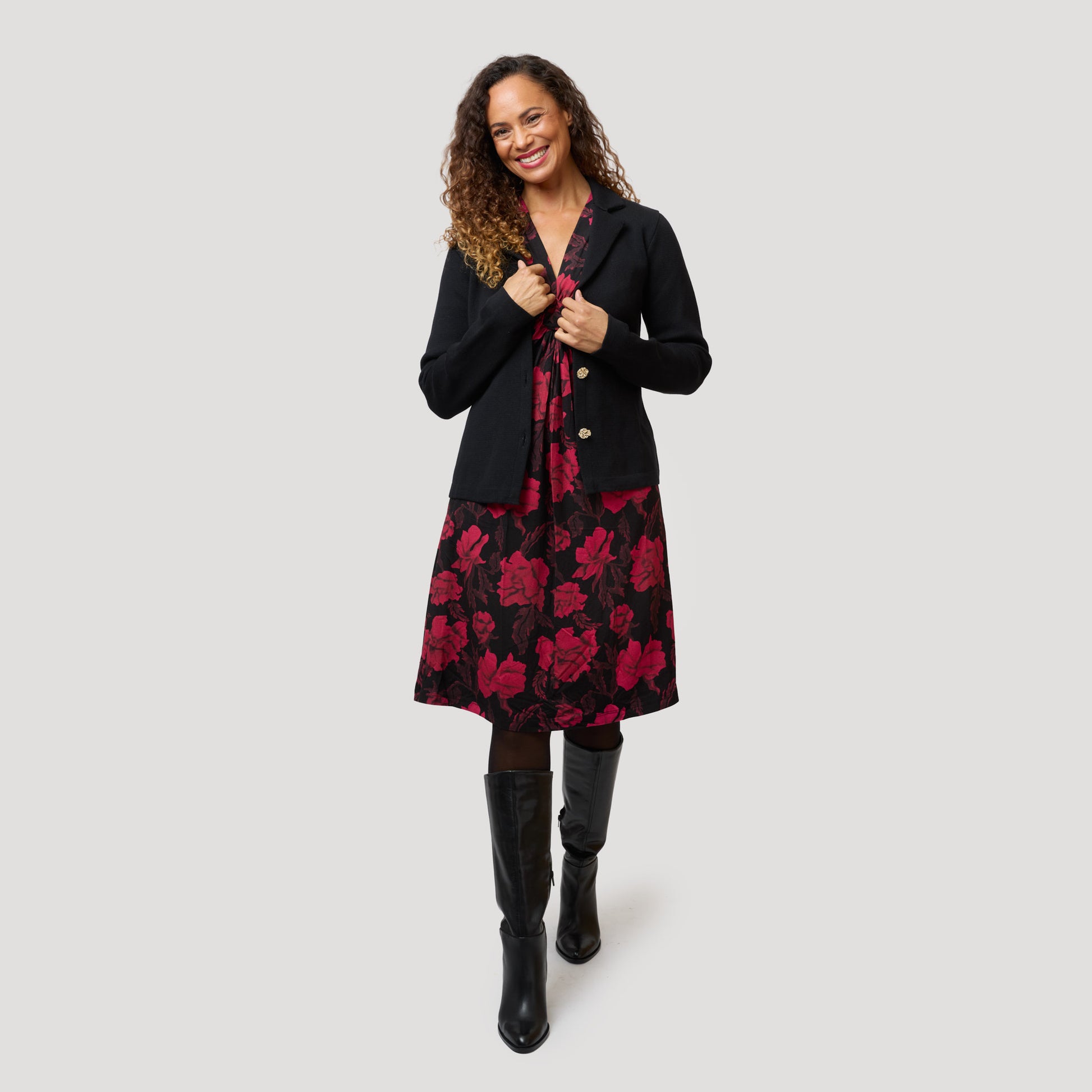 Ruusukuvioinen mekko ja musta neulebleiseri