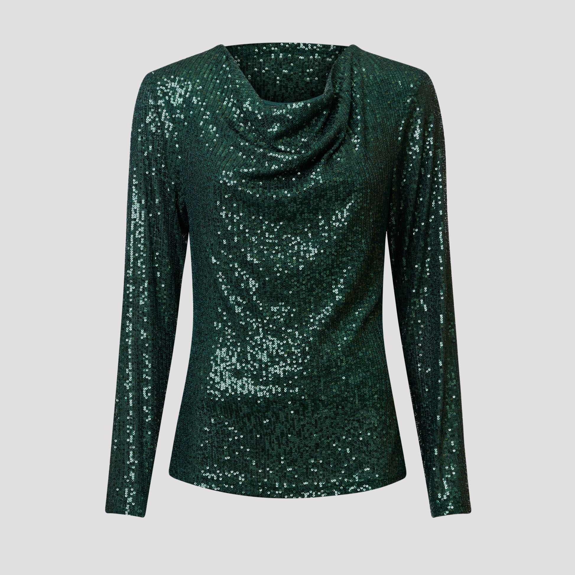 Vihreä paljetein ja pitkin hihoin koristeltu toppi. Juhlatoppi, jossa on vesiputouspääntie, joka tekee siitä joustavan rinnan kohdalta. Tummanvihreä paljetein koristeltu toppi, jossa on joustava, ohut viskoosivuori. Kimaltava toppi sopii täydellisesti kaikkiin juhliin. Mallimme Charlene on 170 cm pitkä ja käyttää kokoa S.