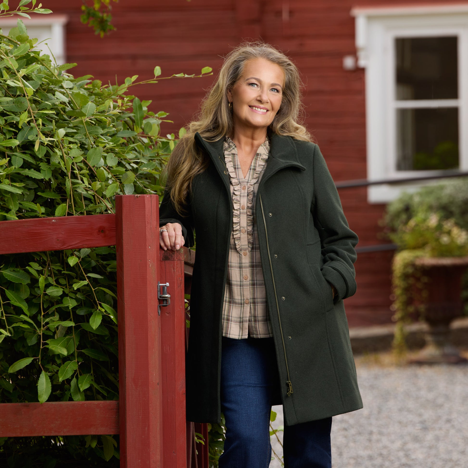Grön, klassisk kappa med skorstenskrage i blandmaterial med ull. Den mörkgröna jackan är avtagen i midjan och har formade sömmar för en smickrande passform. Snygg helfodrad kappa med fickor i sidorna, dragkedja och tryckknappar framtill och två synliga knappar på kragen. Vår modell Yvonne är 170 cm och har storlek 40 på sig.