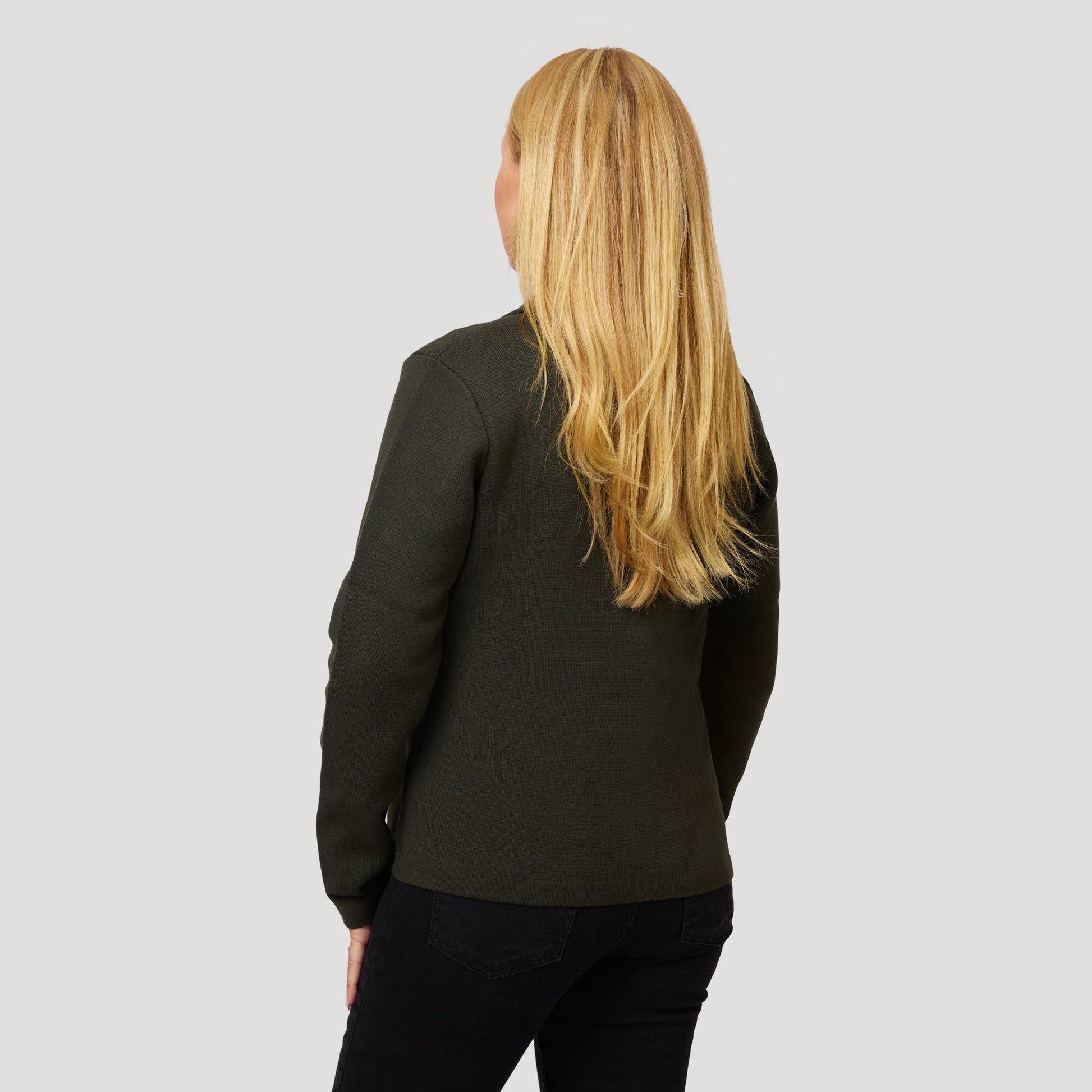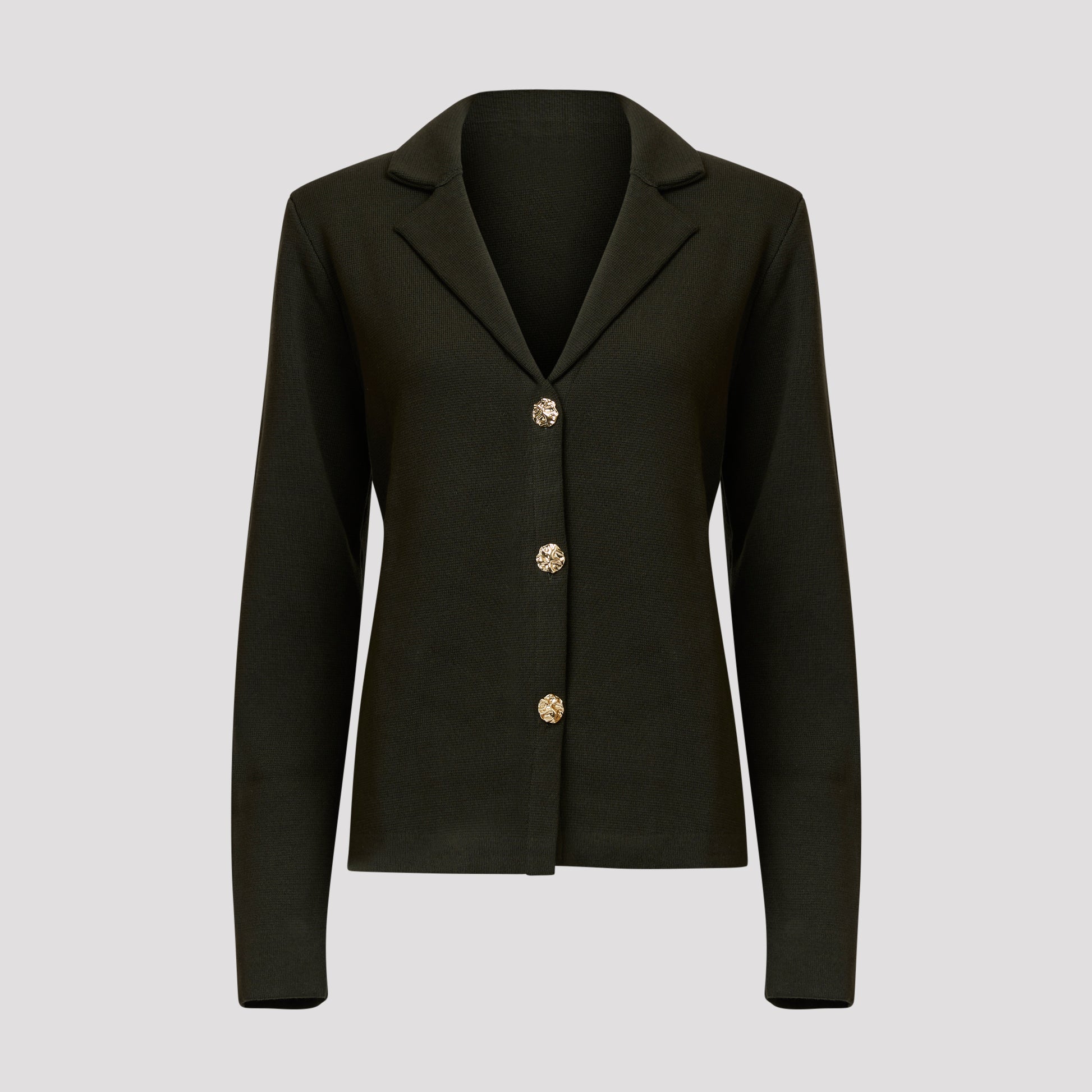 Mörkgrön cardigan i bomull med fina guldknappar i oregelbunden form. Grön stickad kavaj med krage och slag. Jackan är stadigt stickad i 100% bomull. Insvängningen i midjan skapar en smickrande passform. Vår modell Marianne är 170 cm och har storlek S på sig.