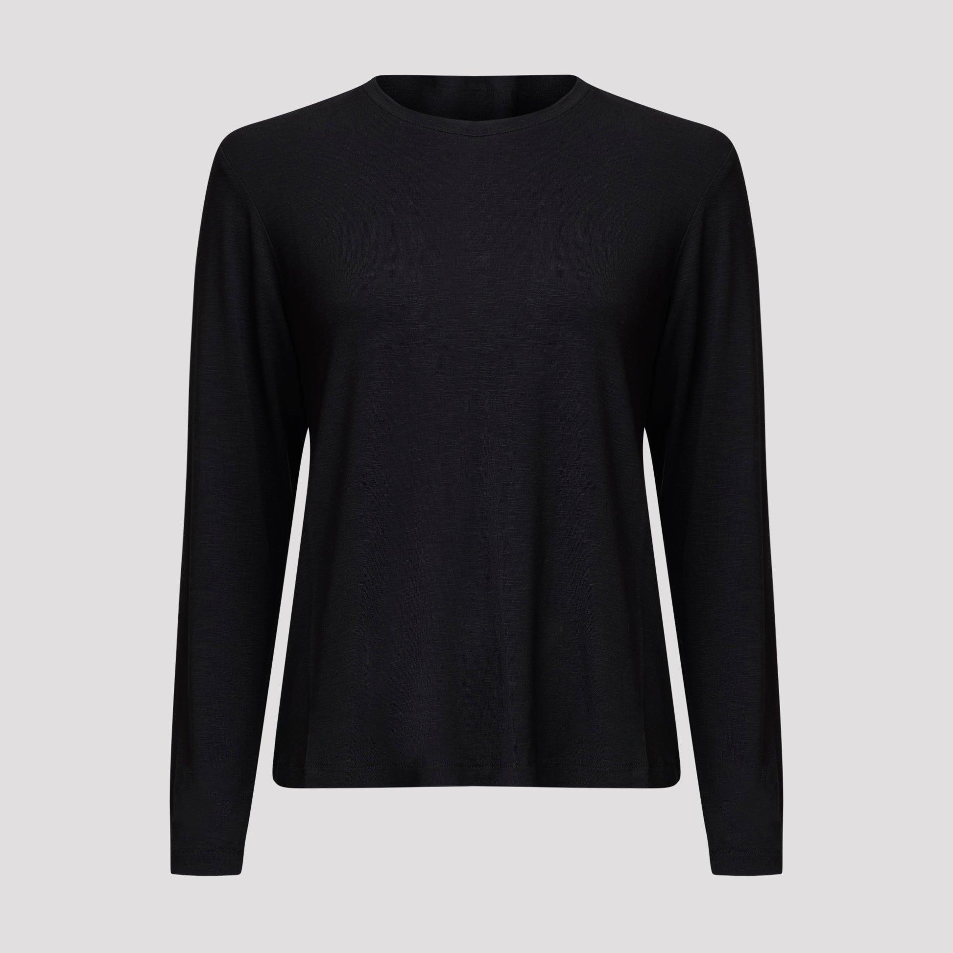 Svart långärmad och rundhalsad t-shirt i viskos som är lite längre bak än fram. Toppen är rundad nertill och är gjord i samma sköna viskos material som vår populära Jolie topp. Perfekt topp för vardag och under en kavaj går den också klä upp till festligheter. Vår modell Yvonne är 170 cm och har storlek M på sig.