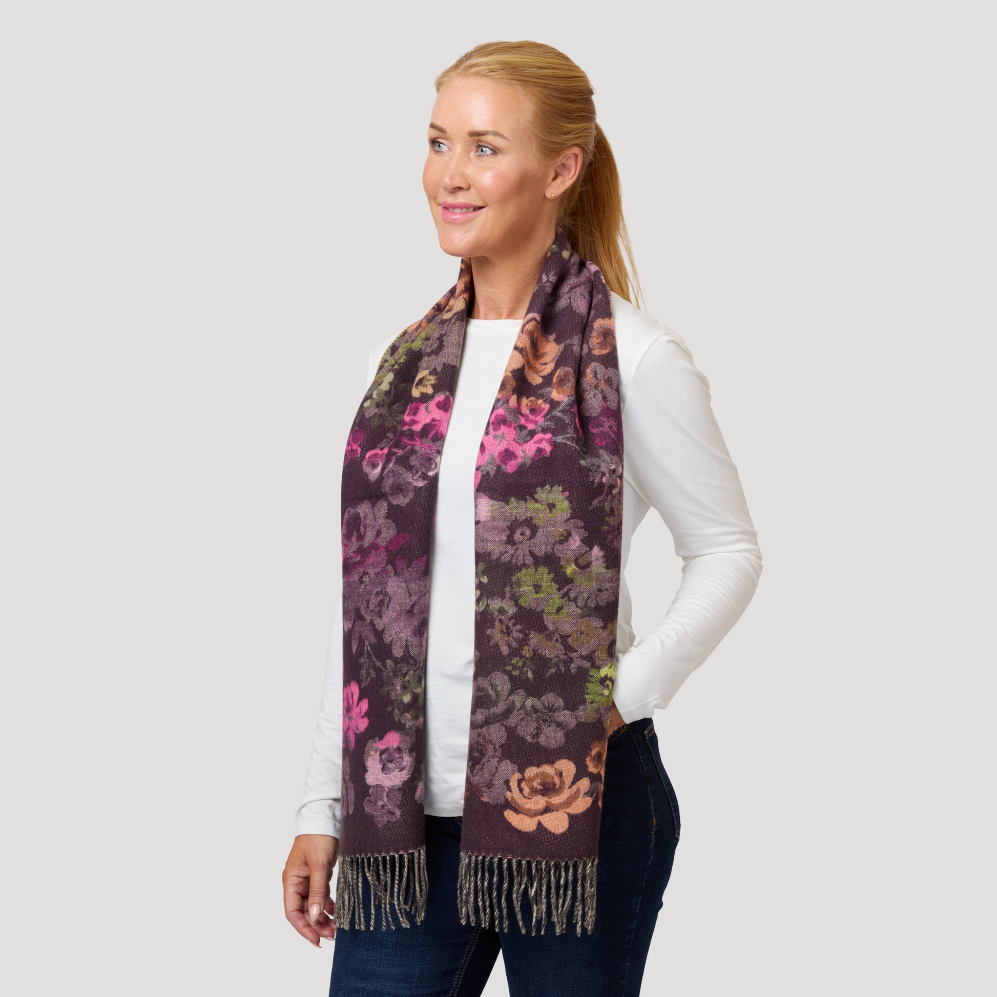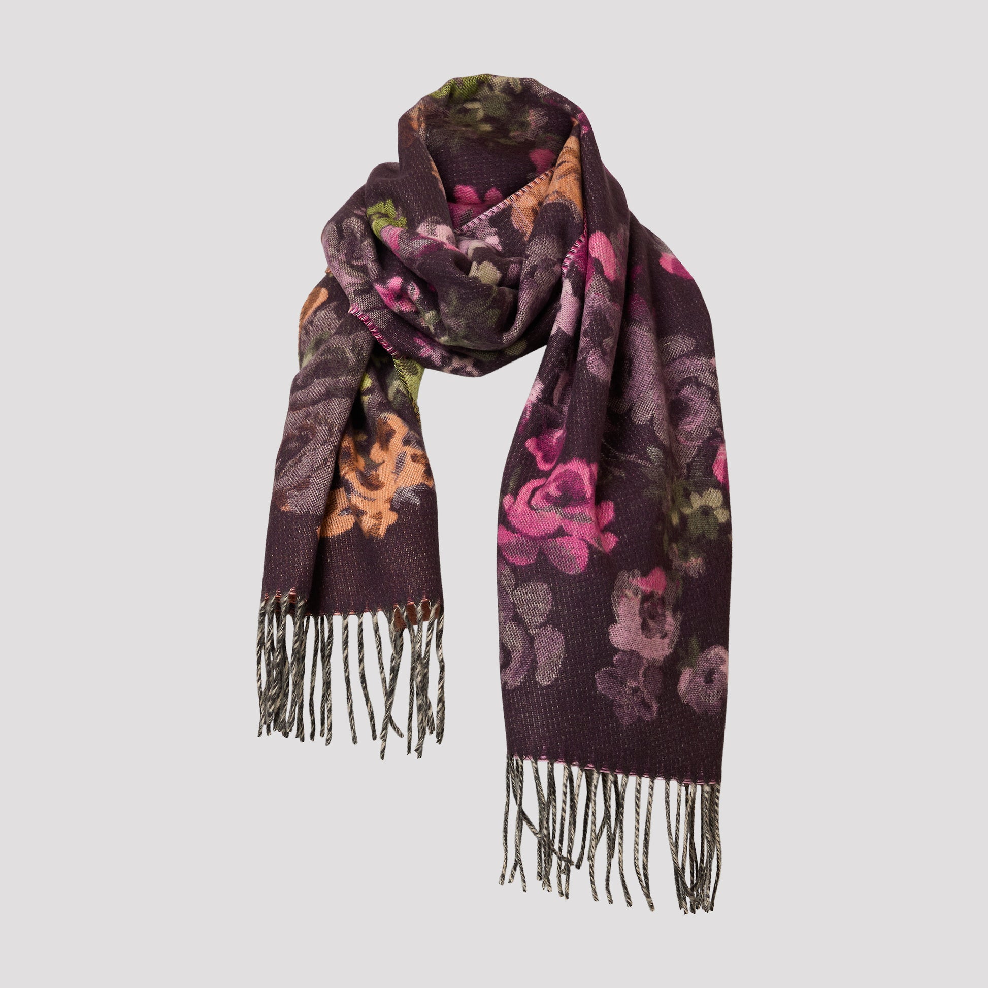 Mjuk halsduk med vackert blommönster på vinröd botten. Den sköna halsduken är värmande men tunn.