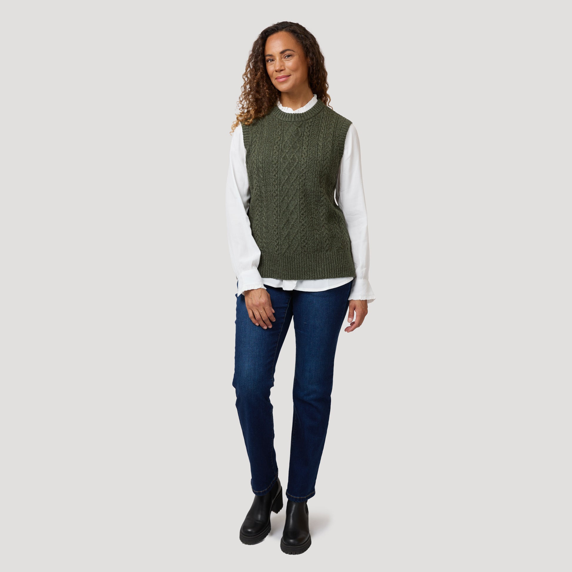 Kabelstickad mörkgrön väst över vit blus