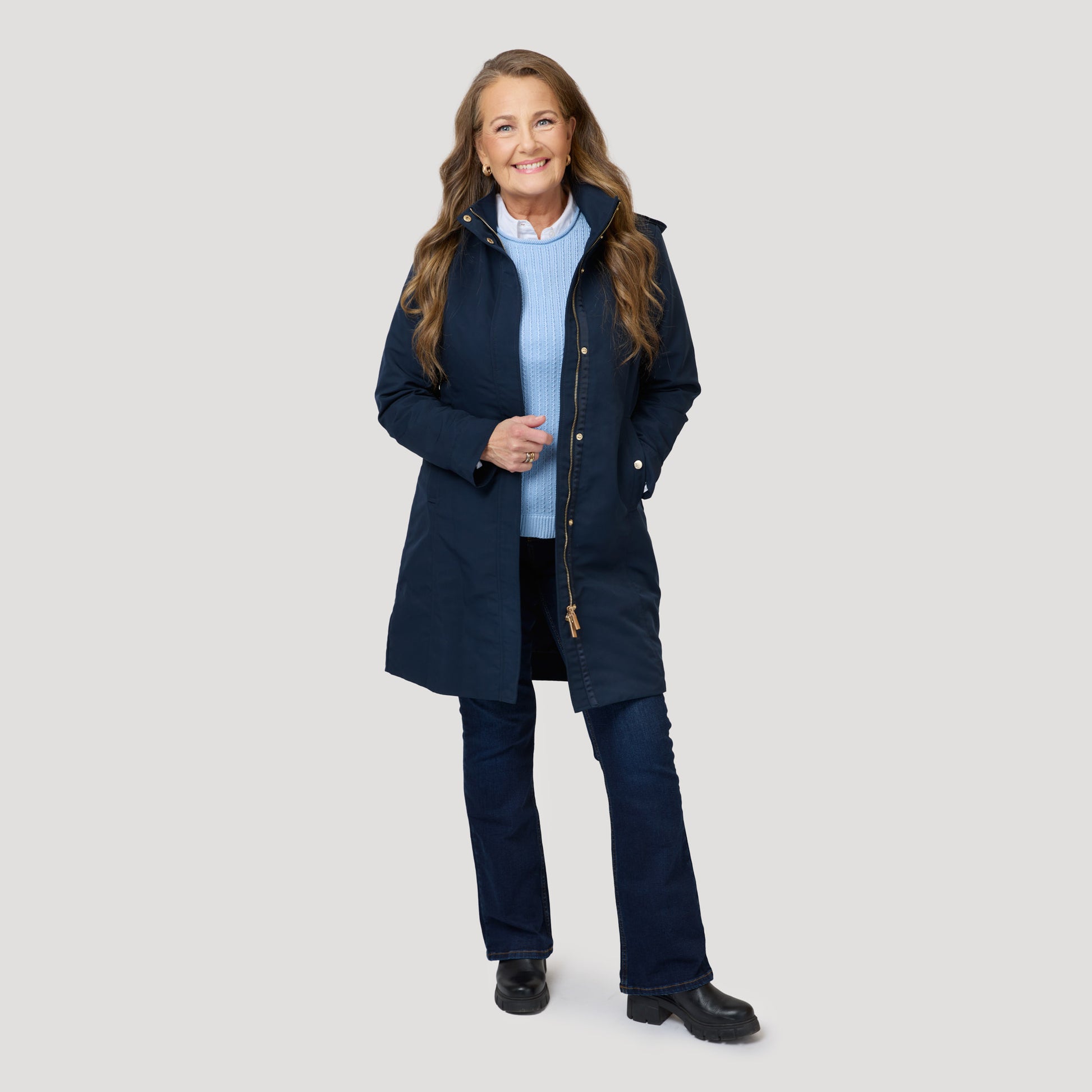 Rundhalsad ljusblå tröja under mörkblå jacka