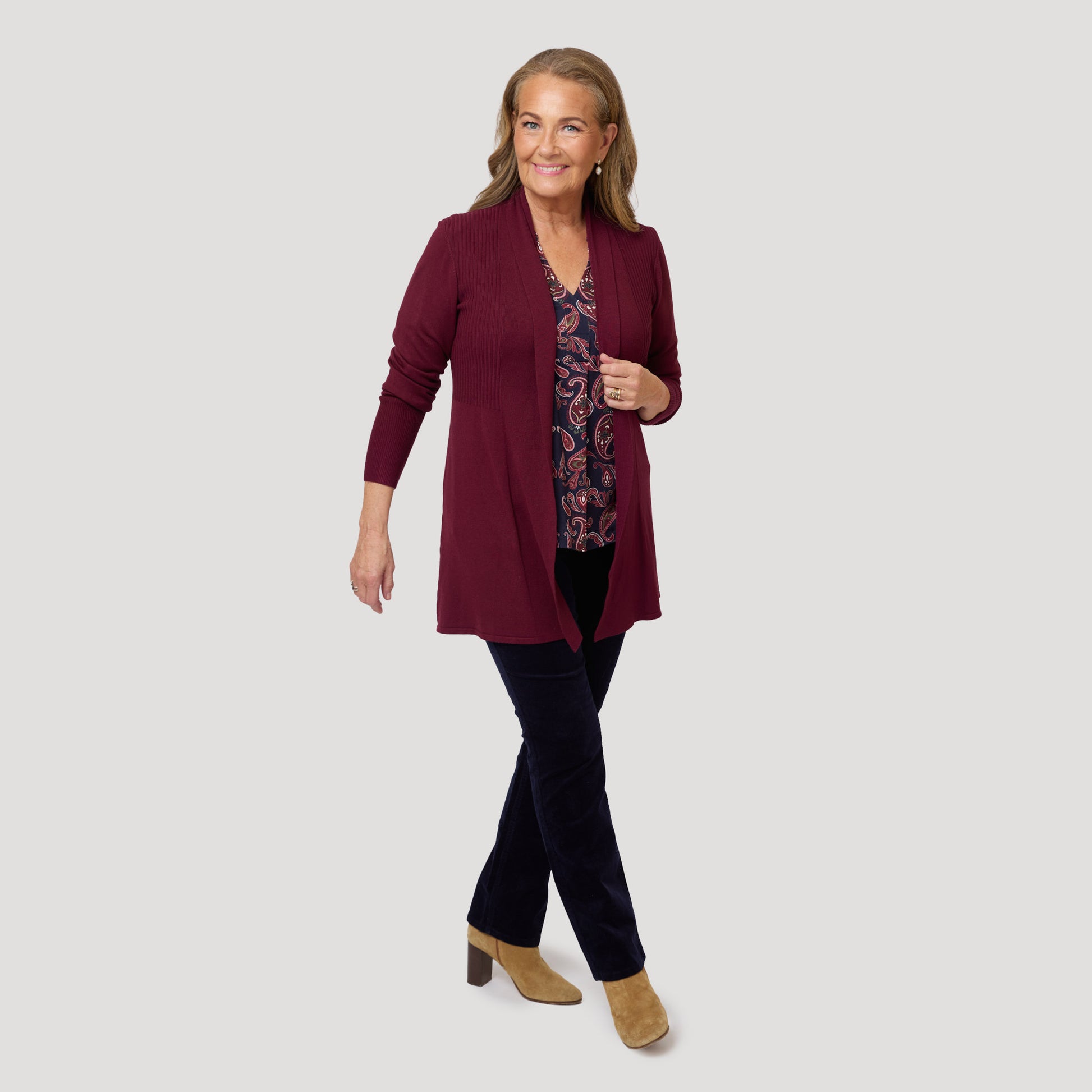 V-ringad trikåtopp till manchesterjeans i mörkblått