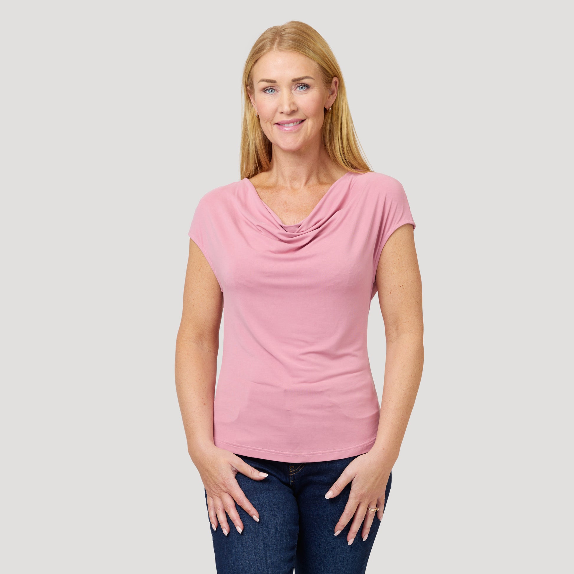 Rosa draperad topp med kort ärm. En snygg användbar topp både till fest och till vardags. Tröja i trikå med vattenfalls urringning som ger plagget en mer flexibel passform, ifall du vill bära den mer kroppsnära så kan du ta en storlek mindre än du brukar välja. Vår modell Marianne är 173 cm och har storlek M på sig.